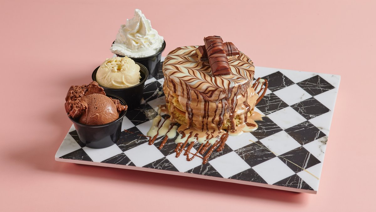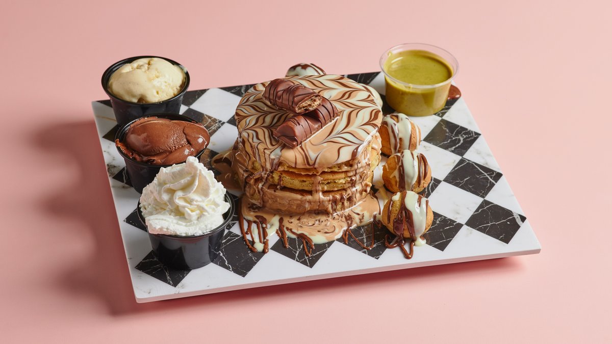 3 שכבות פנקייק, 6 יח' כדורי פנקייק, 2 טעמי גלידה, קרם אחד לפנקייק שכבות ו-2 רטבים | מוגש עם שני כדורי קצפת