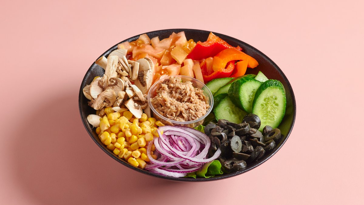 חסה, מלפפון, עגבניה, זיתים שחורים, תירס וטונה