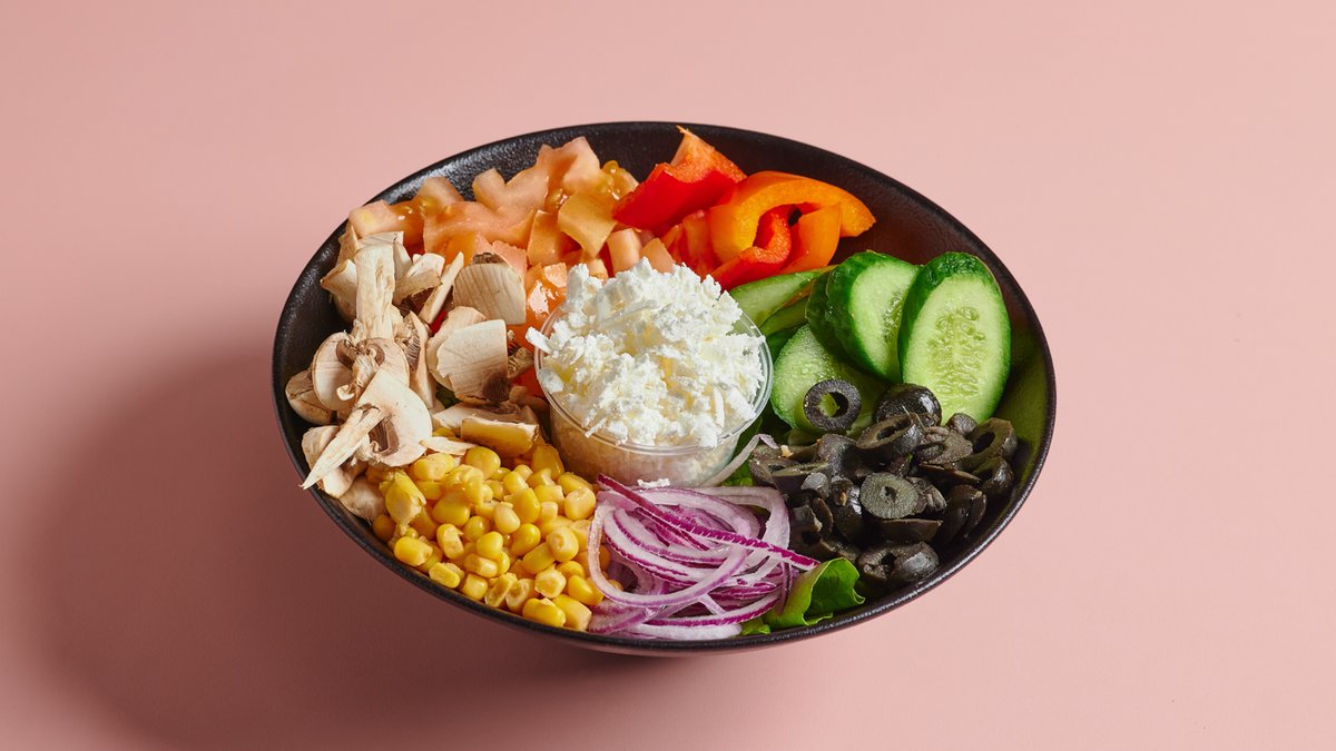 חסה, מלפפון, עגבניה, זיתי קלמטה, פטריות טריות, תירס, בולגרית