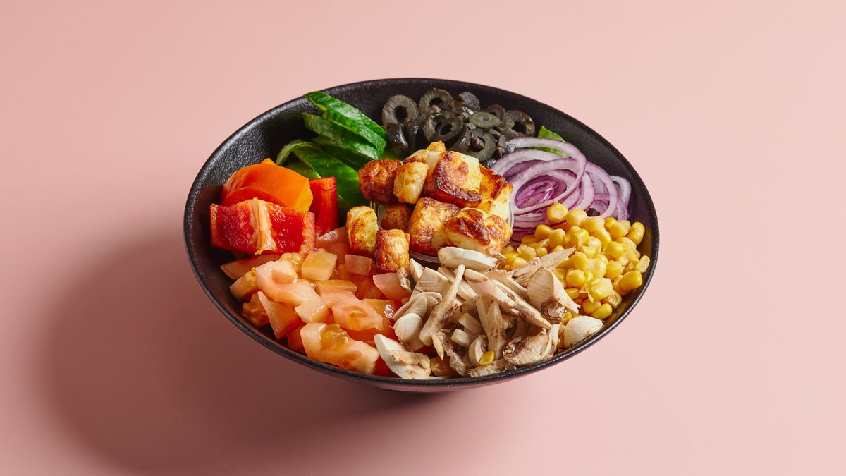 חסה, מלפפון, עגבניה, זיתי קלמטה, פטריות טריות, תירס, קוביות גבינה חלומי