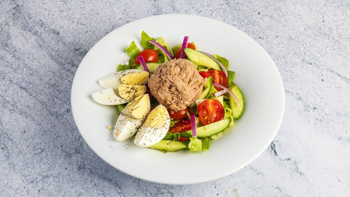 ביצה וטונה על מצע חסה, מלפפון, גמבה אדומה,שרי, בצל סגול.