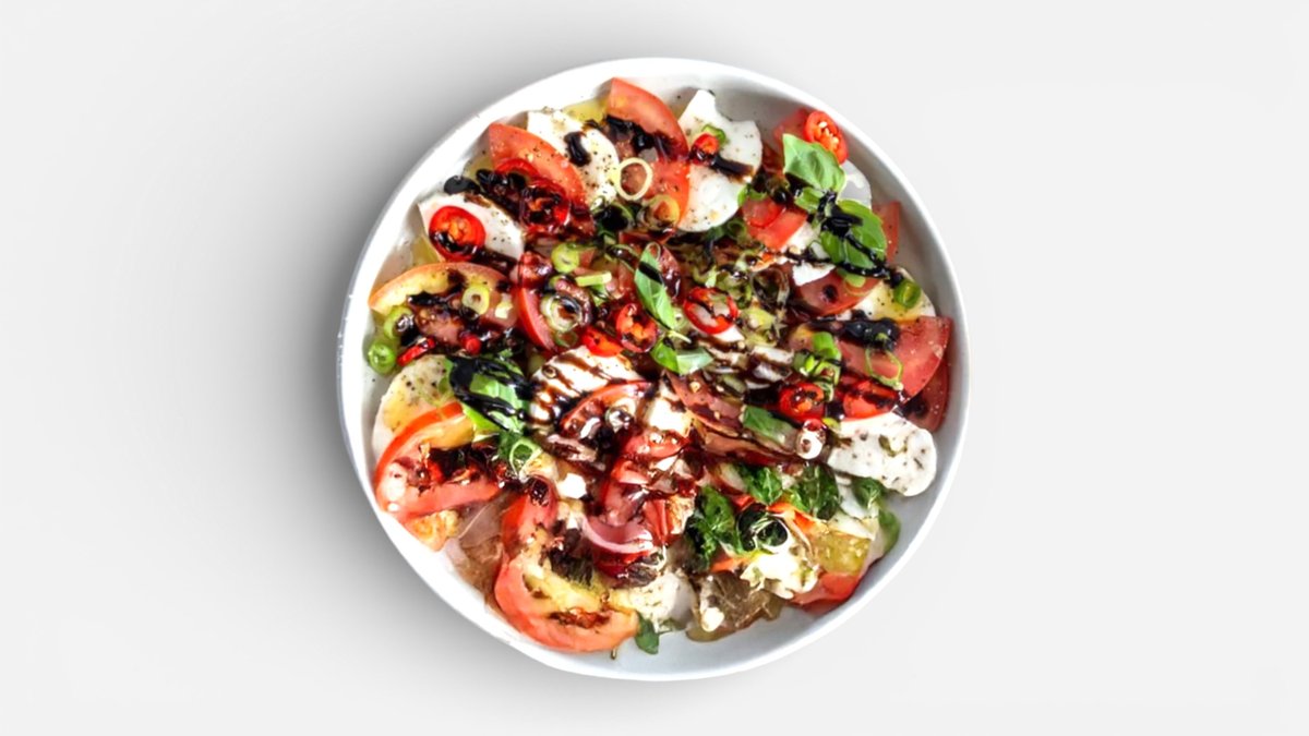 מוצרלה פרסקה, עגבניות שרי, בצל סגול, בזיליקום, בצל ירוק, מלח פלפל, שמן זית, מיץ לימון ובלסמי מצומצם שומנים 30.4, פחמימות 81.1, קלוריות 732, חלבון 30.4