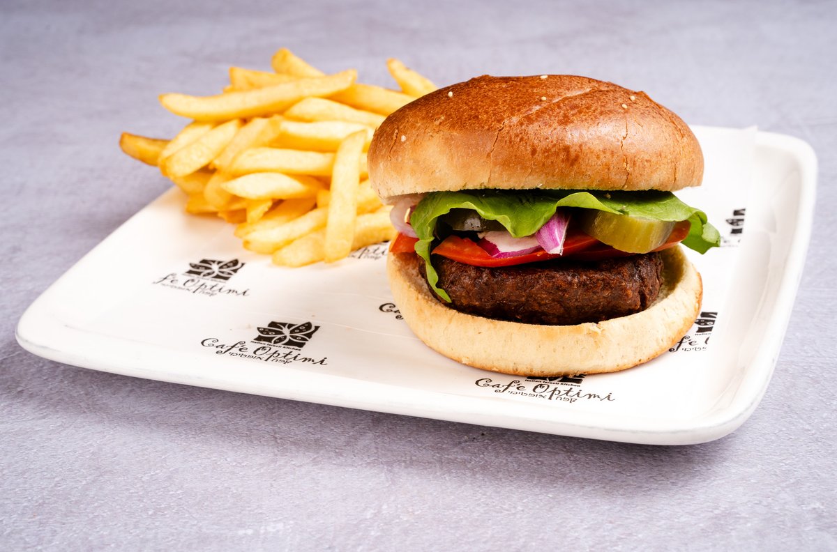 המבורגר טבעוני ללא גלוטן בלחמניה ללא גלוטן עם קטשופ, מיונז טבעוני, חסה, עגבניה, בצל ומלפפון חמוץ מוגש עם תוספת וסלט בצד
