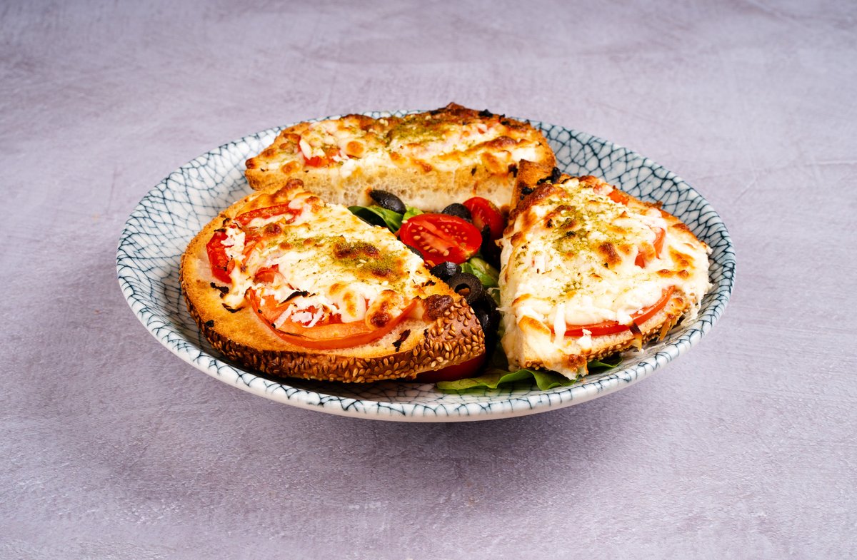 בייגל טוסט פתוח עם עגבניה, מוצרלה, גבינה בולגרית, זעתר, שמן זית מוגש על סלט ירוק עם זיתים שחורים