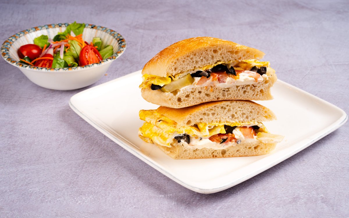 גבינת שמנת, חביתה, עגבניה, מלפפון כבוש וזיתים שחורים בלחם לבחירה