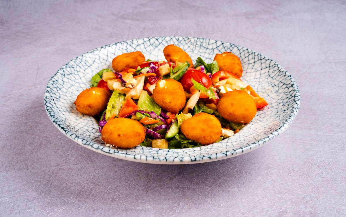 גבינת עיזים מטוגנת בציפוי פירורי לחם, חסה, עגבניות שרי, מלפפון חתוך גס, פלפל אדום, כרוב סגול, פטריות שמפניון וגזר ברוטב ויניגרט