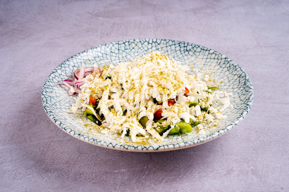 חסה, עגבניה, מלפפון, גבינה בולגרית, בצל סגול, זיתים שחורים וזעתר