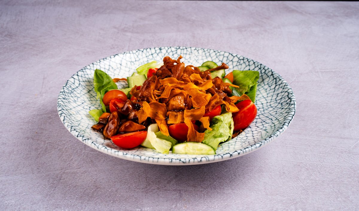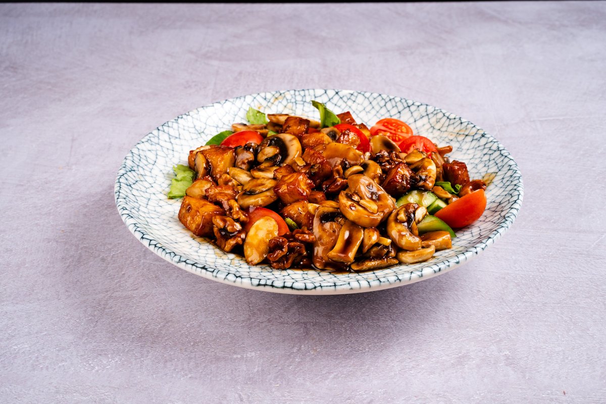 פטריות, אגוזי מלך, קשיו ושקדים מוקפצים עם גבינת טופו ברוטב טריאקי על בסיס חסה, פרוסות מלפפון, עגבניות שרי