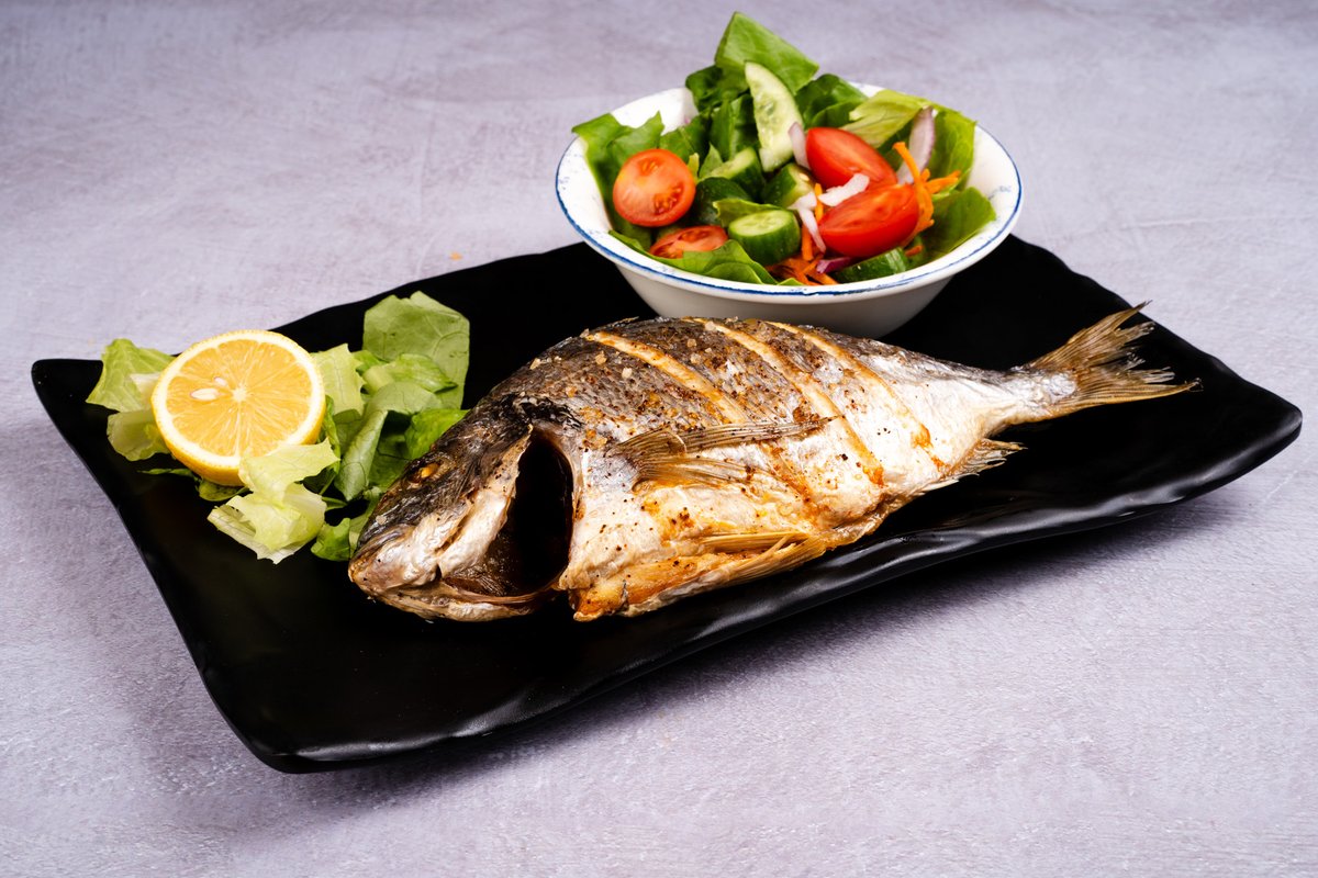 פילה סלמון אפוי בתנור עם מלח ופלפל גס, מוגש עם תוספת וסלט בצד