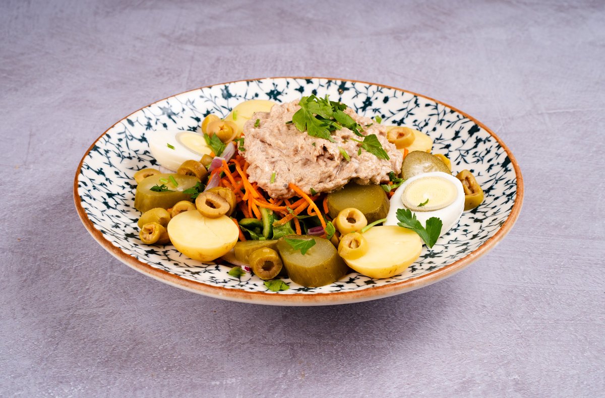 חסה, עגבניה, מלפפון, תפו"א, ביצה קשה, טונה במיונז, מלפפון כבוש, בצל, גזר וזיתים ירוקים