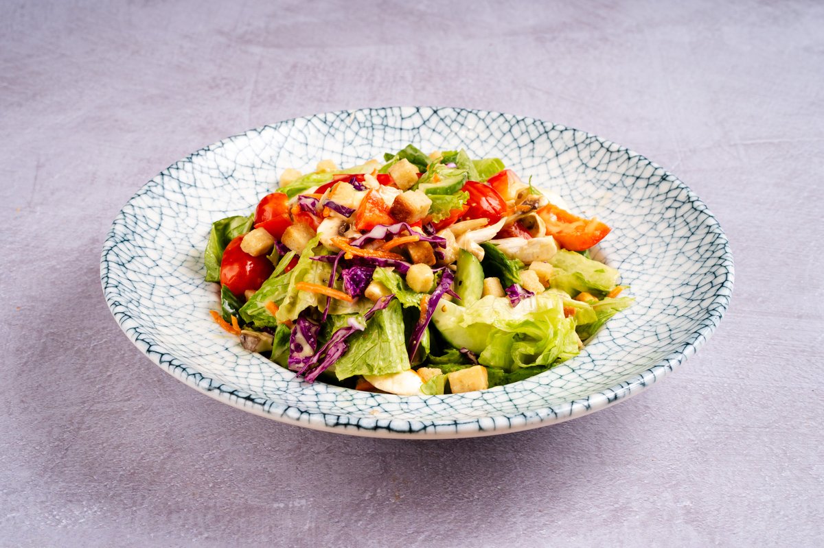 חסה, עגבניות שרי, מלפפון חתוך גס, פלפל אדום, כרוב סגול, פטריות שמפניון, גזר וקרוטונים ברוטב ויניגרט