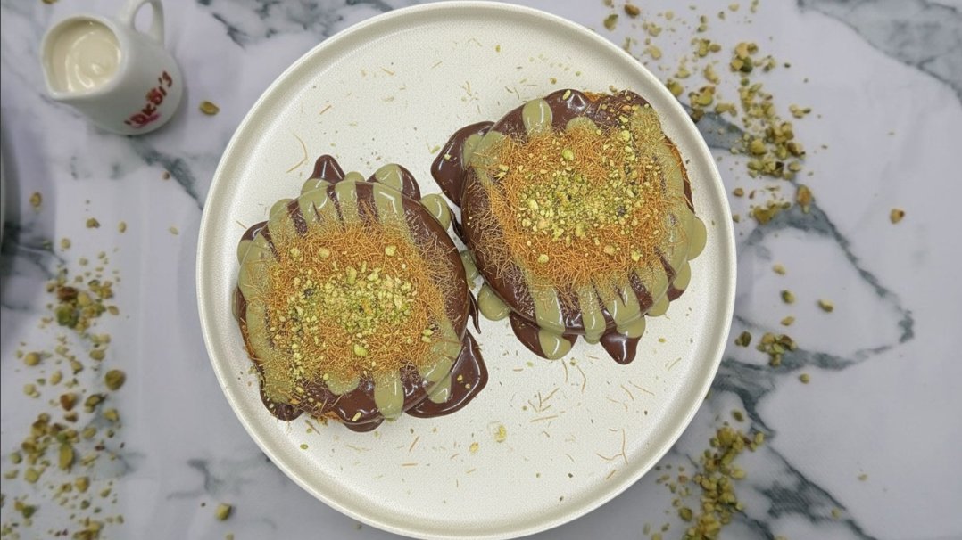 2 פנקייקים עם זילוף שוקולד אגוזי לוז, קרם פיסטוק, שיערות קדאיף ושברי פיסטוק קלוי