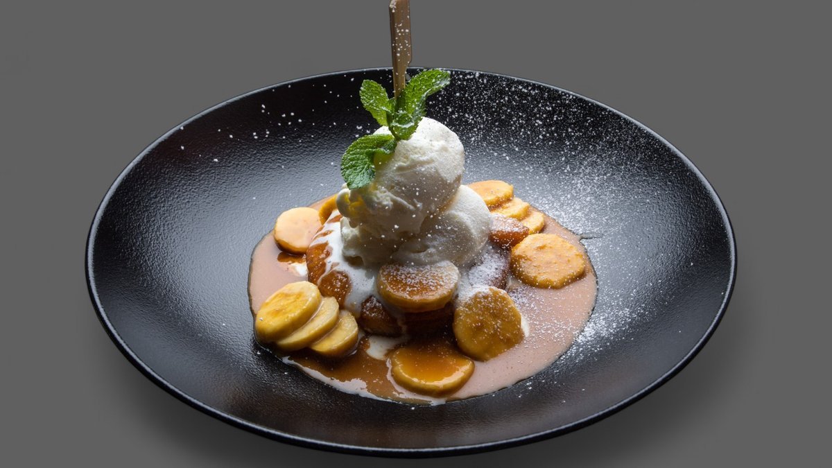 בננות מוקפצות עם קרמל על טארט שקדים וחמאה מוגש עם גלידת וניל
