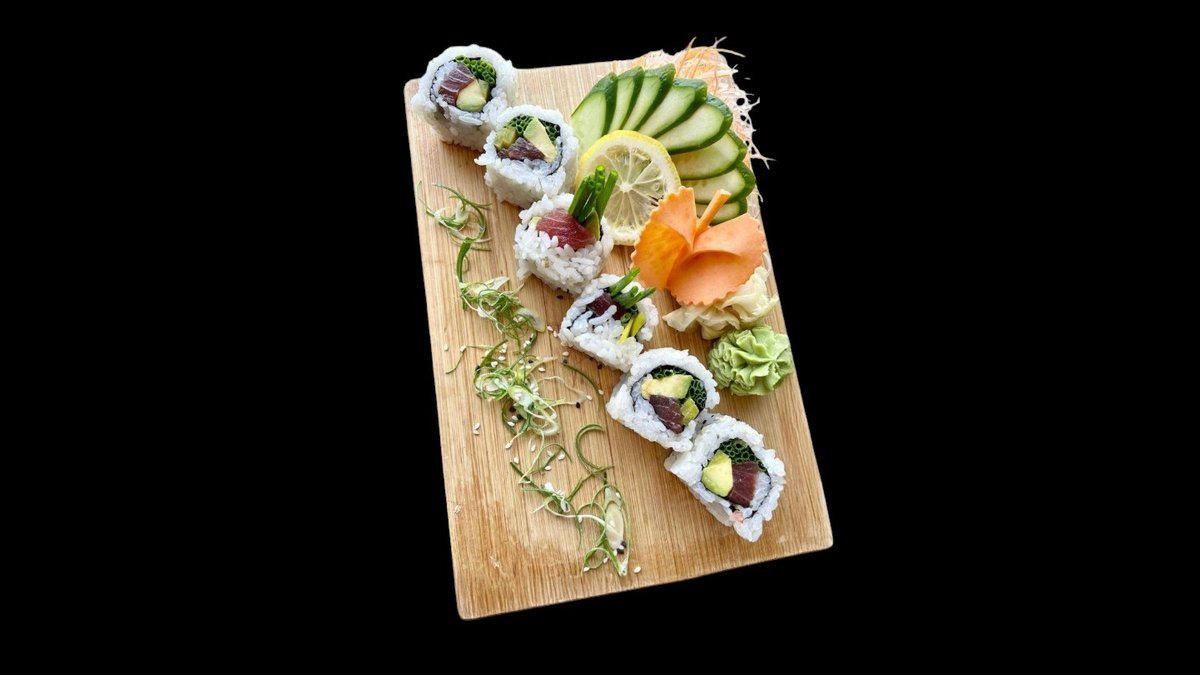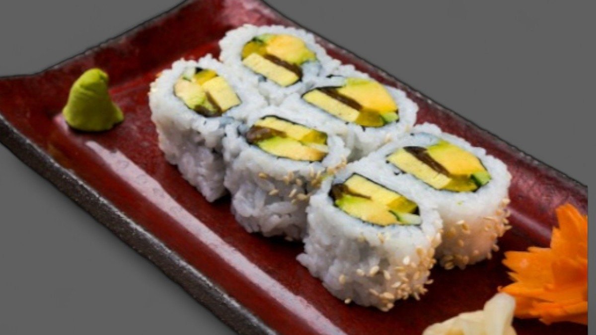 אבוקדו, מלפפון, בצל ירוק, טמאגו וספייסי מיונז במעטפת אבוקדו
