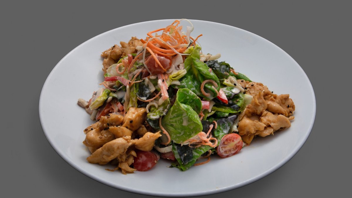 סלט עשיר בירוקת עם רוטב ויניגרט טחינה סילאן מתקתק, חסה, אצות וואקה, גזר, גמבה אדומה, פטריות, עגבניות שרי, מלפפונים ואטריות אורז מטוגנות.