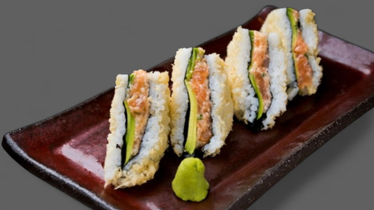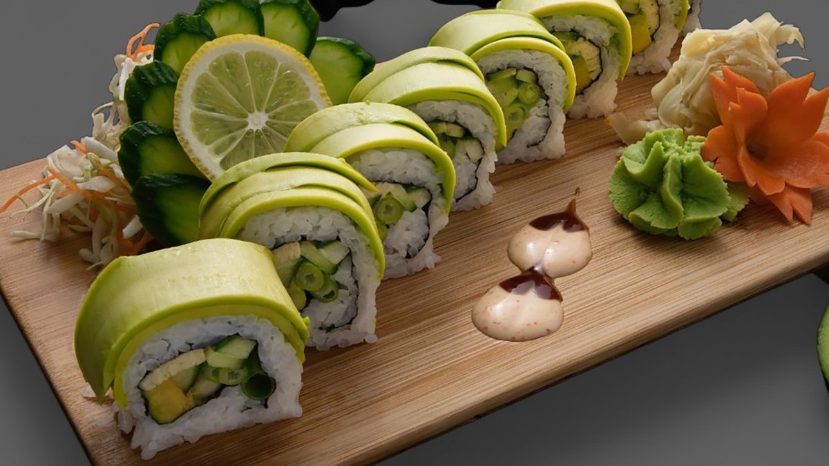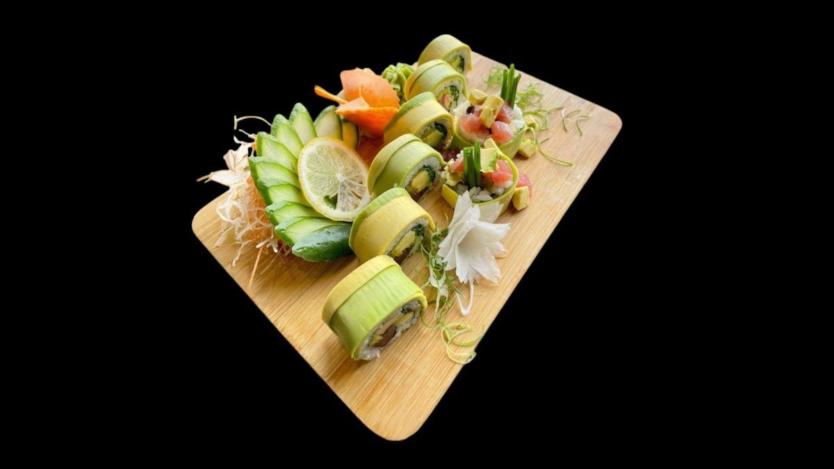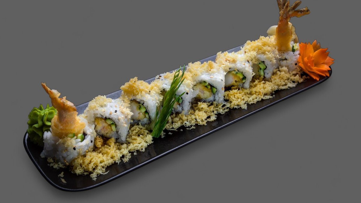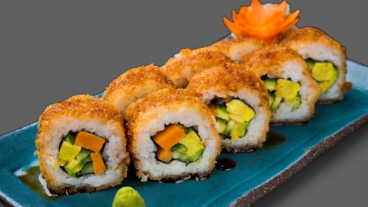 ספייסי טמפורה, קנפיו, מלפפון, אבוקדו ובצל ירוק במעטפת אבוקדו ובצל מטוגן