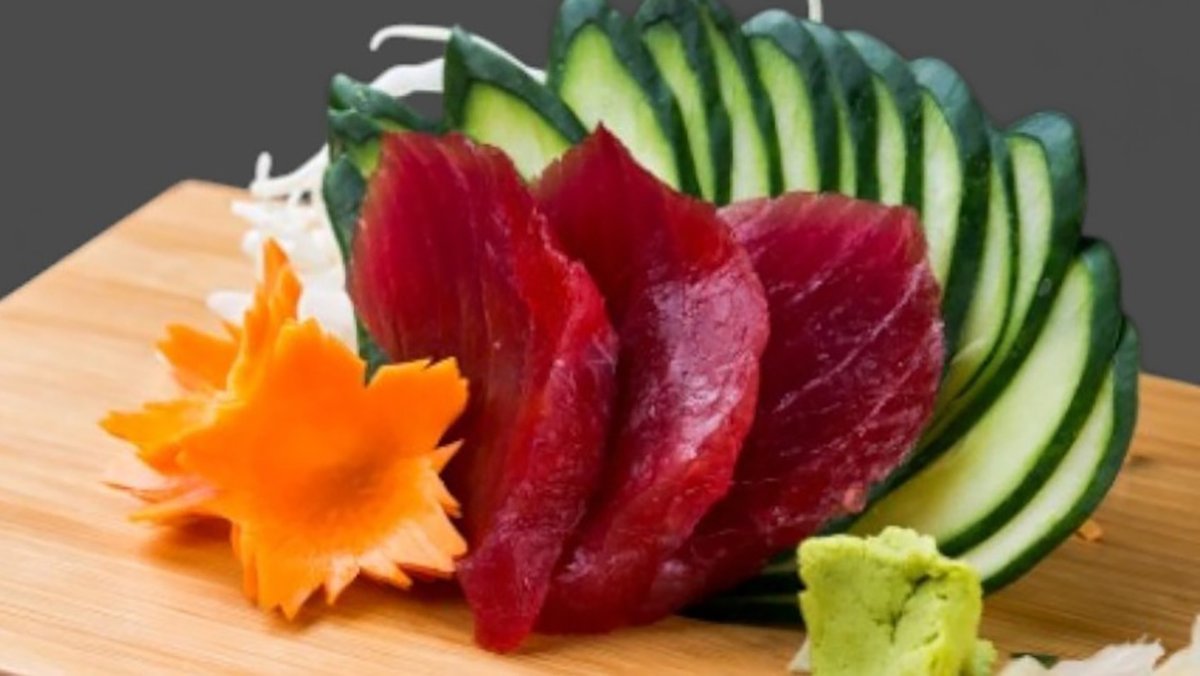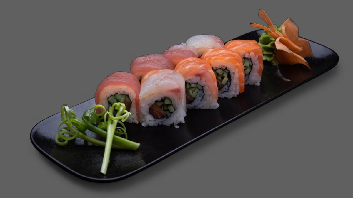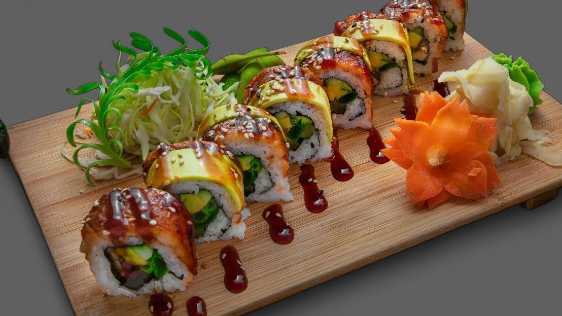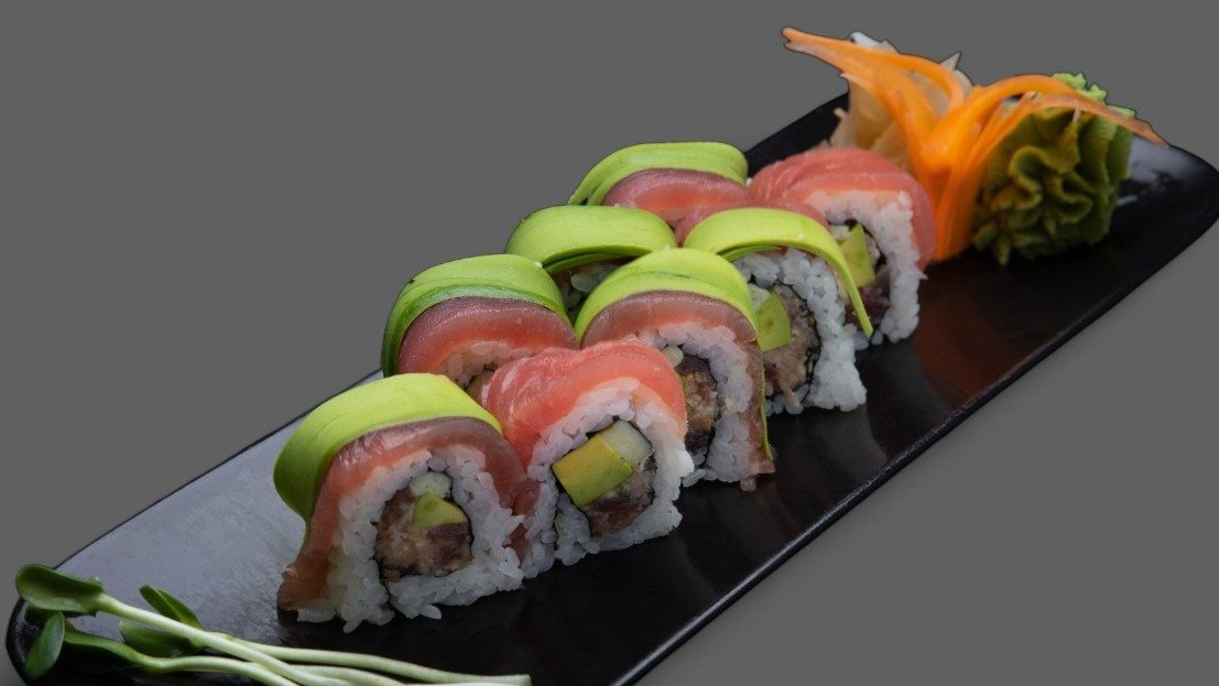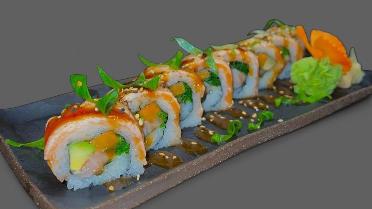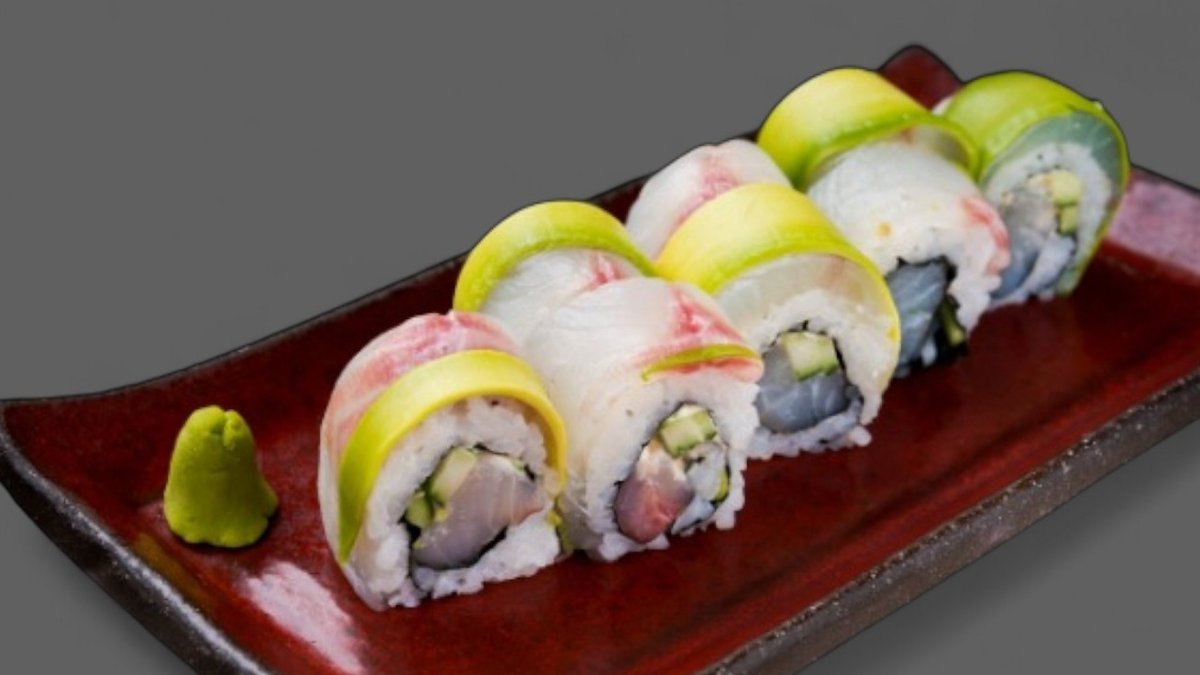 ספייסי טמפורה, קנפיו, מלפפון, אבוקדו ובצל ירוק במעטפת אבוקדו ובצל מטוגן