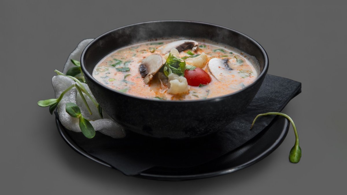 מרק תאילנדי מסורתי על בסיס חלב קוקוס וצ'ילי, פירות ים, פטריות, עגבניות שרי, כוסברה, בצל ובצל ירוק מוגש עם אורז