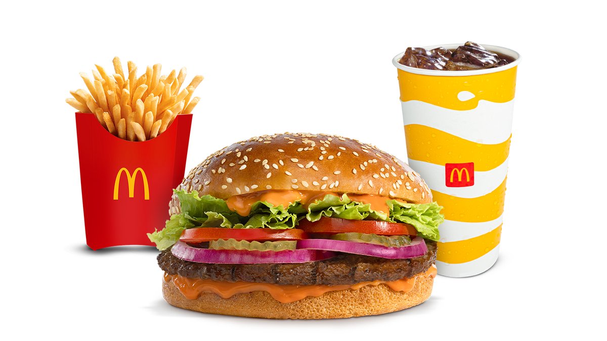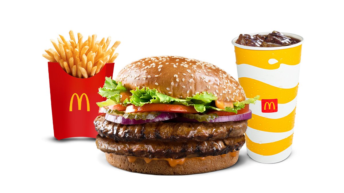 שתי קציצות של מק רויאל בלחמניה עם חסה פרימיום, עגבניה, בצל סגול, חמוצים ורוטב רויאל חריף הארוחה מוגשת עם צ'יפס ענק ושתיה 520 מ"ל