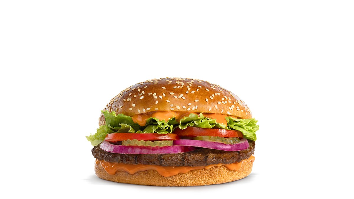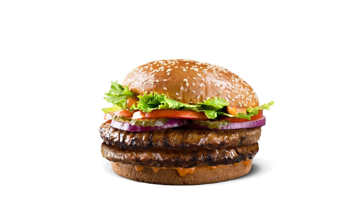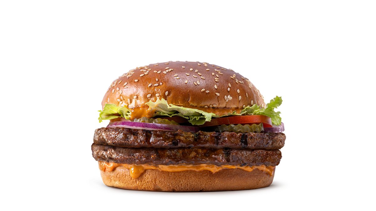 המבורגר מק רויאל, מוגש בלחמניה בתוספת חסה, עגבניה, בצל סגול וחמוצים, עם רוטב סמוקי החדש שלנו - צ'יפוטלה מיונז מעושן