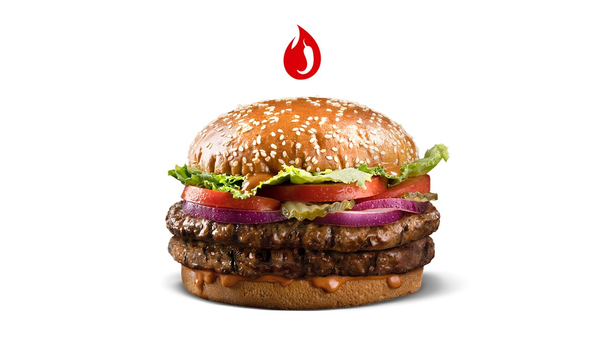 חזה עוף בציפוי קריספי חריף בלחמניית מגה עם חסה פרימיום, עגבניה ורוטב רויאל חריף אש