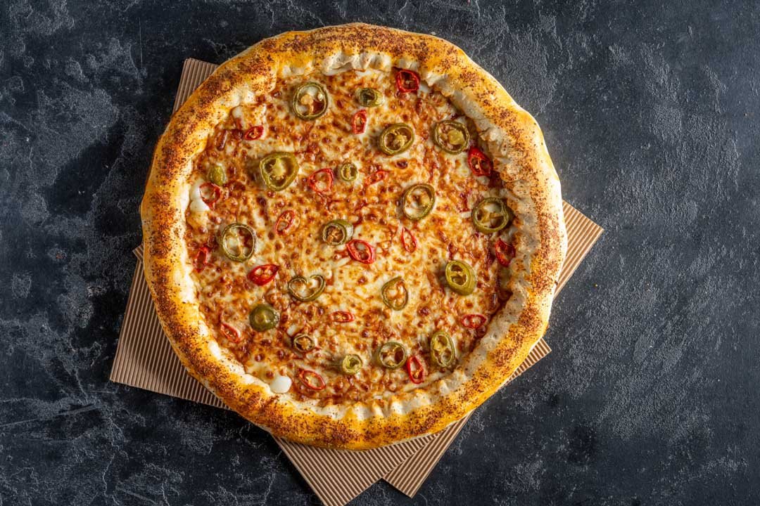 פיצה עוצמתית שלא עושה הנחות לאוהבי החריף! פיצה מבצק דק עם שוליים ממולאים בגבינת מוצרלה וחתיכות חלפיניו. בתוספת מוצרלה, רוטב פיצה, נגיעות טבסקו, חלפיניו וצ'ילי אדום
