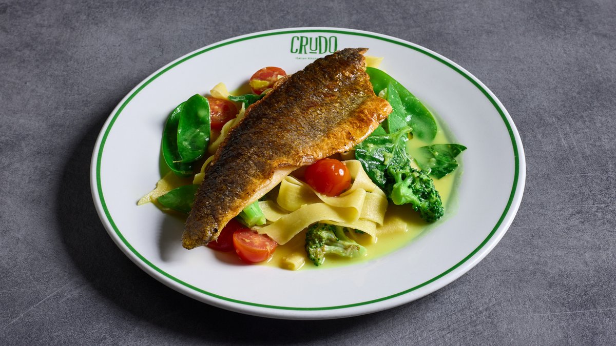 טליאטלה לימונית, ירקות ירוקים ועגבניות שרי צלויות בטאבון