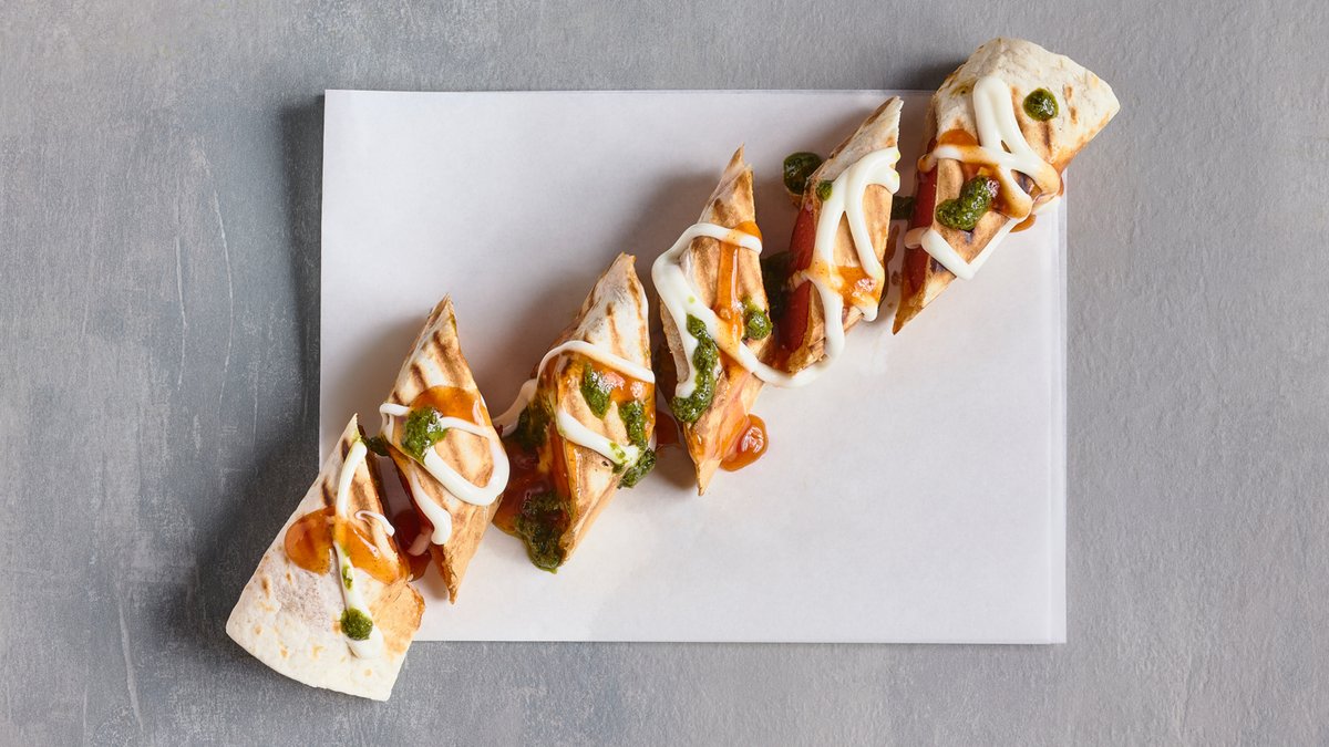 טורטיה עם נקניקיה, ברוטב שום, צ׳ילי, פסטו
