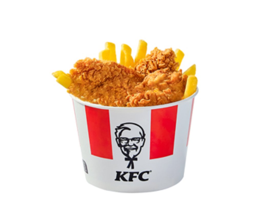 באקט 14 סטריפס, 4 עוף על העצם, 2 בקבוקי שתייה, 2 דונאטס