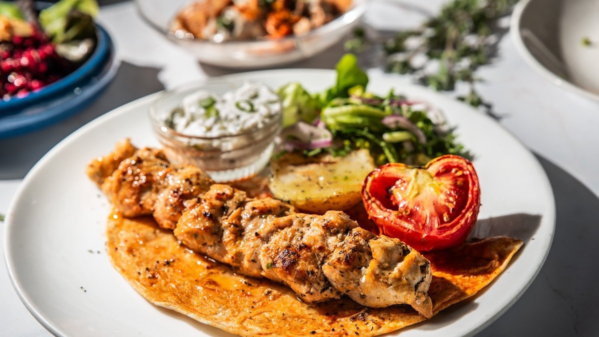 קוביות חזה עוף במרינדת יוגורט, בצל ופטרוזיליה, לוואש, עגבנייה ותפו״א צלויים. מוגש לצד טחינה