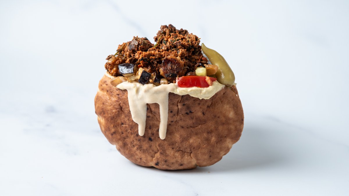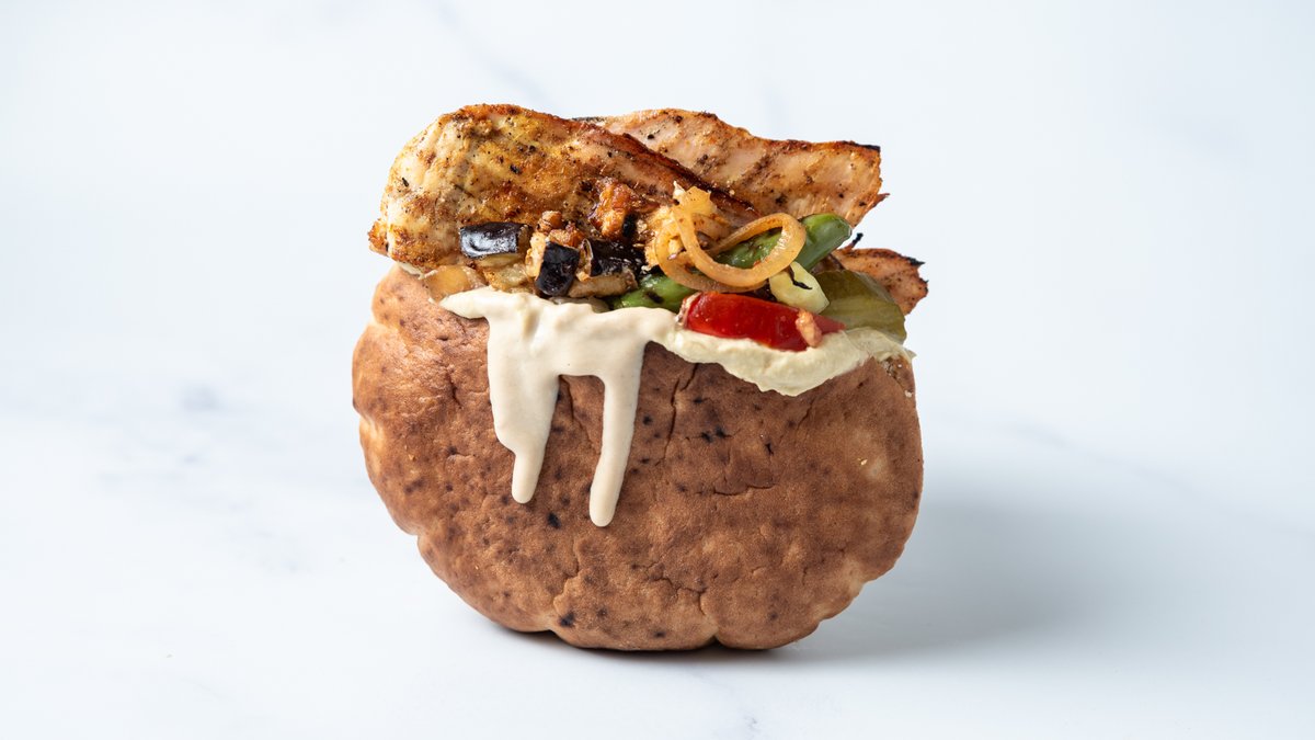 פיתה מאודה עם חציל, ביצה קשה, תפוח אדמה. בחרו סלטים וממרחים