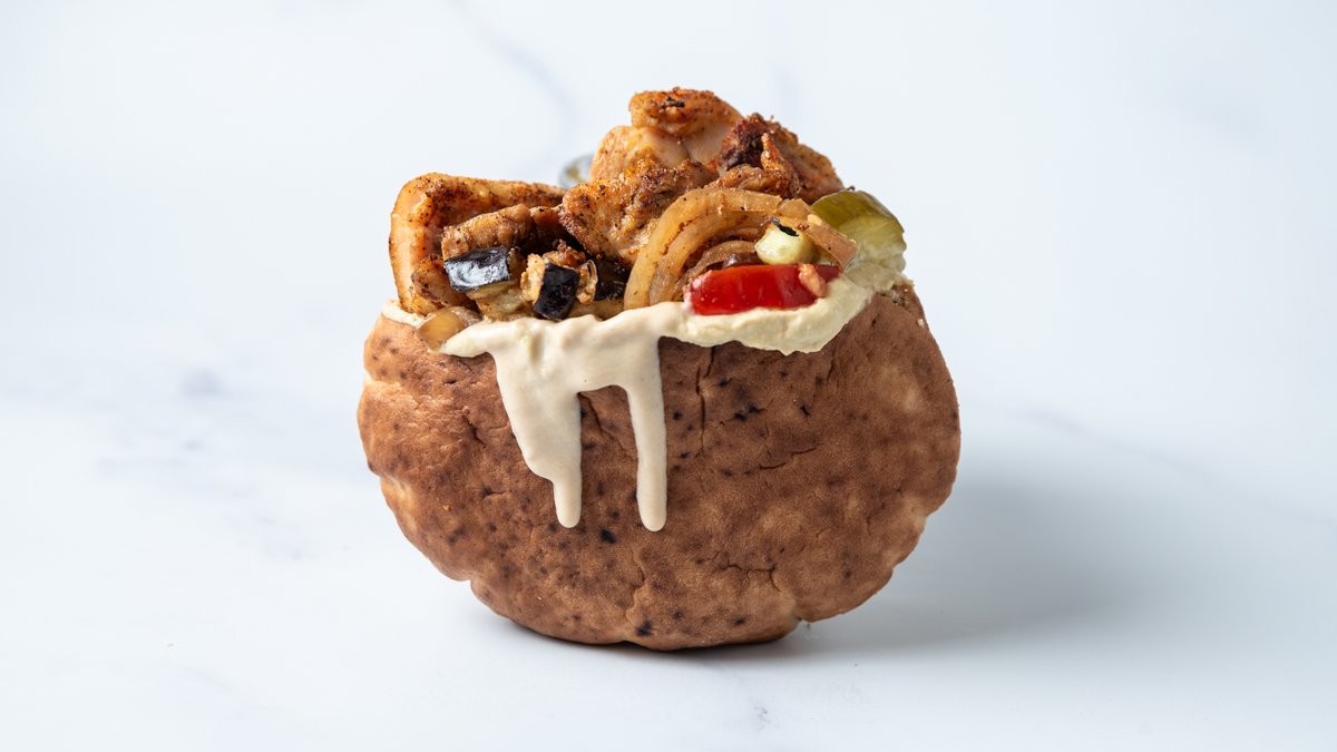 פיתה מאודה עם חציל, פלאפל, ביצה קשה, תפוח אדמה. בחרו סלטים וממרחים