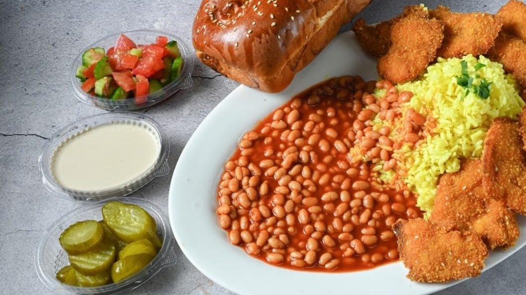 שניצל עם שעועית לבנה ברוטב עגבניות, אורז, חלה וסלטים