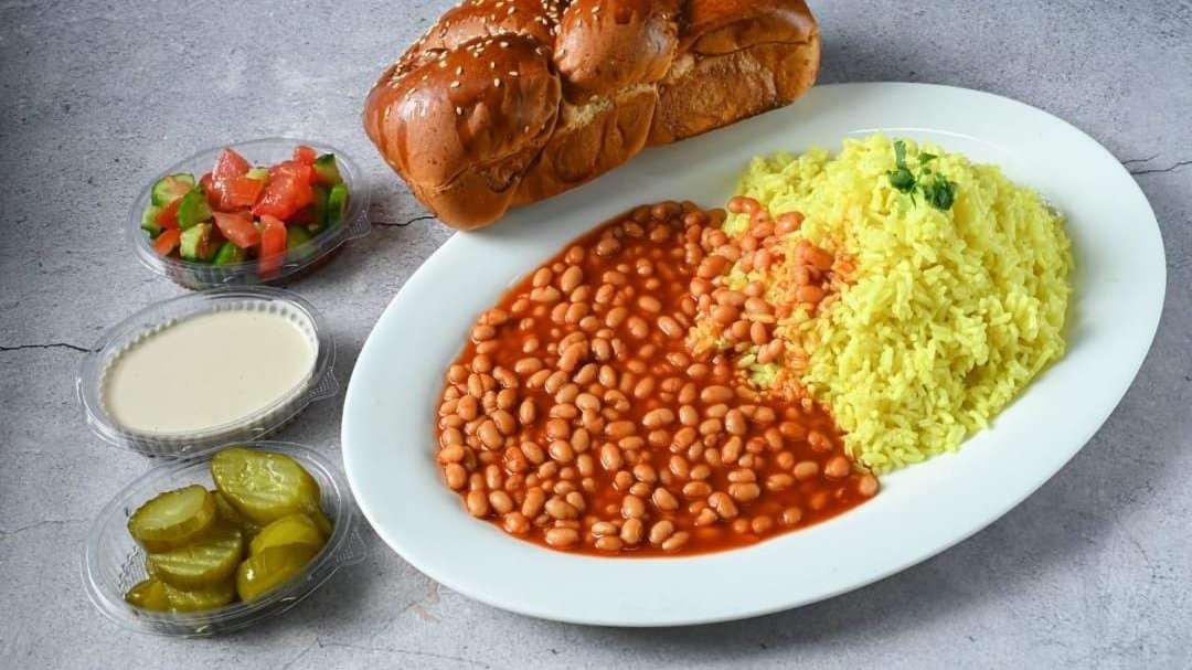 שעועית לבנה ברוטב עגבניות עם אורז, חלה וסלטים