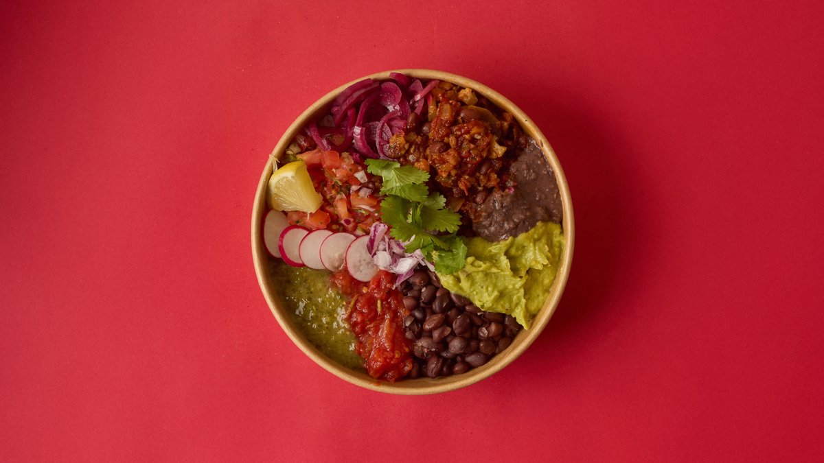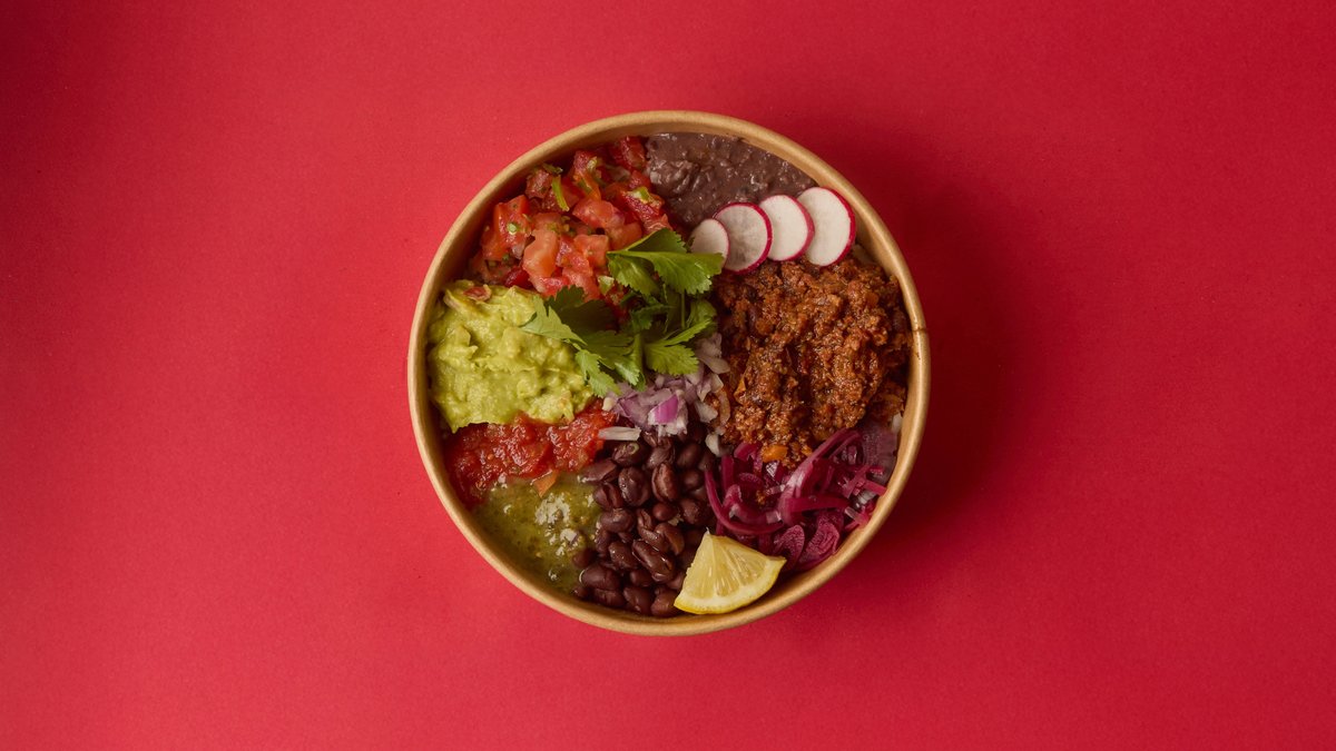 תבשיל מקסיקני עם בשר טחון ושעועית שחורה, אורז, גווקאמולה, פריחולס, סלסה ורדה, סלסה רוחה, פיקו דה גאיו, בצל מומחץ, שעועית, בצל סגול, צנונית וצ'ימיצ'ורי