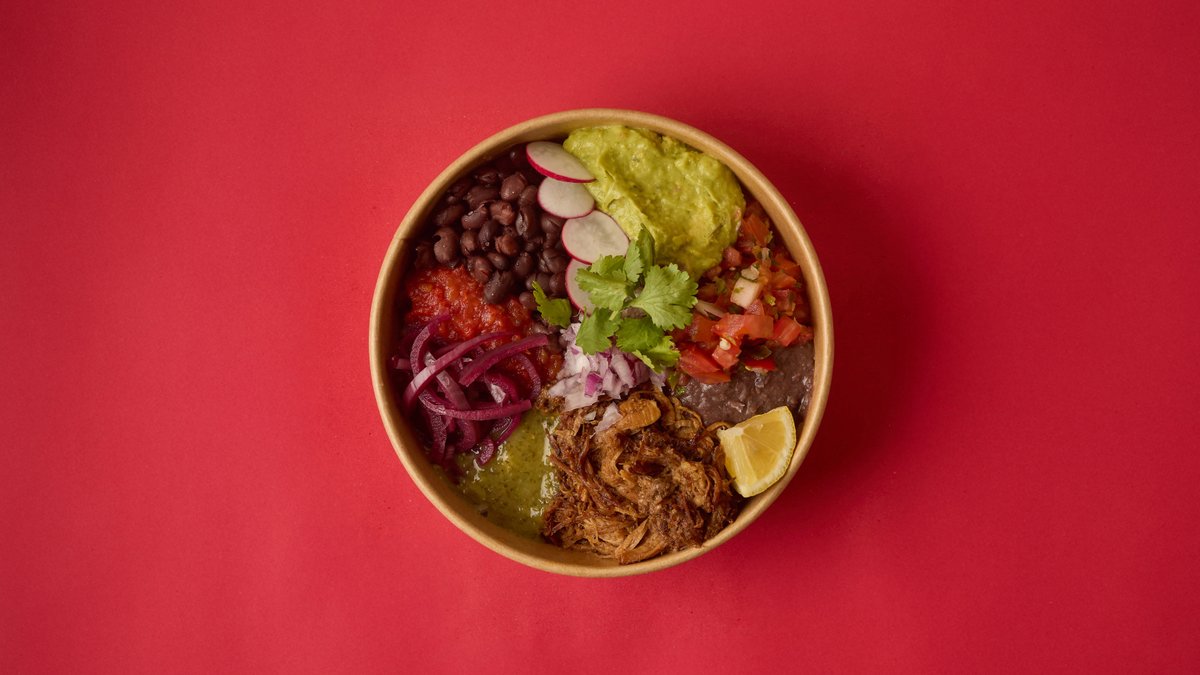 תבשיל מקסיקני מרידיפיין, אורז, שעועית, גוואקמולה, פריחולס, צנונית, סלסה ורדה, סלסה רוחה, פיקו דה גאיו, בצל מוחמץ וכוסברה