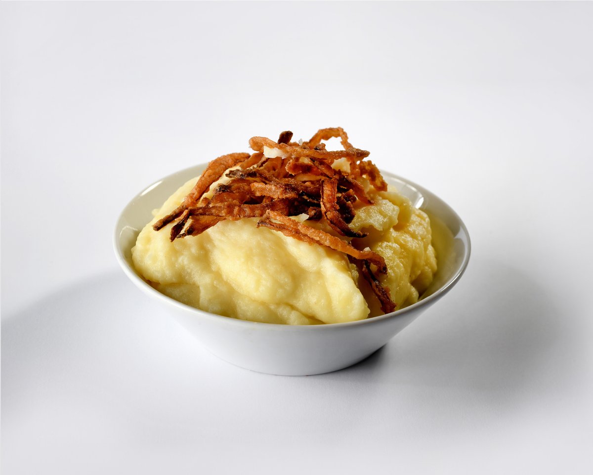 קבויות תפו"א מטוגנות עם רצועות בצל דקיקות ברוטב צ'ילי, מעוטרות בטבעות בצל ירוק