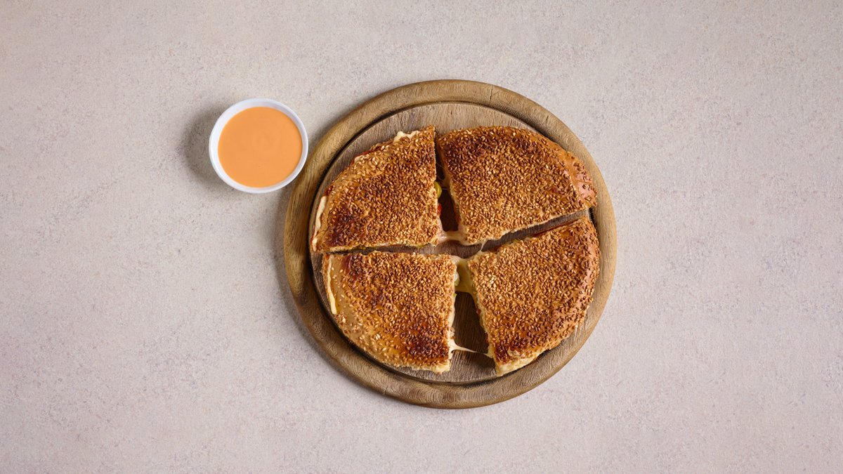 גבינה צהובה, רוטב פיצה, זיתים ועגבנייה, מוגש עם זיתים ורוטב אלף האיים