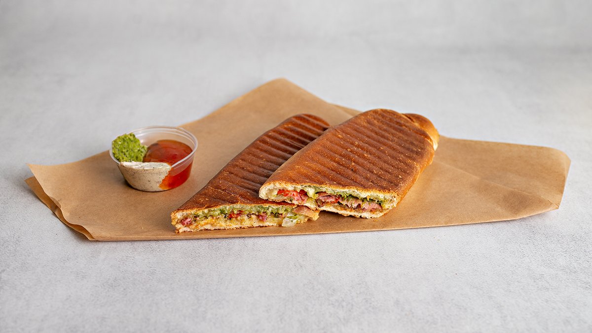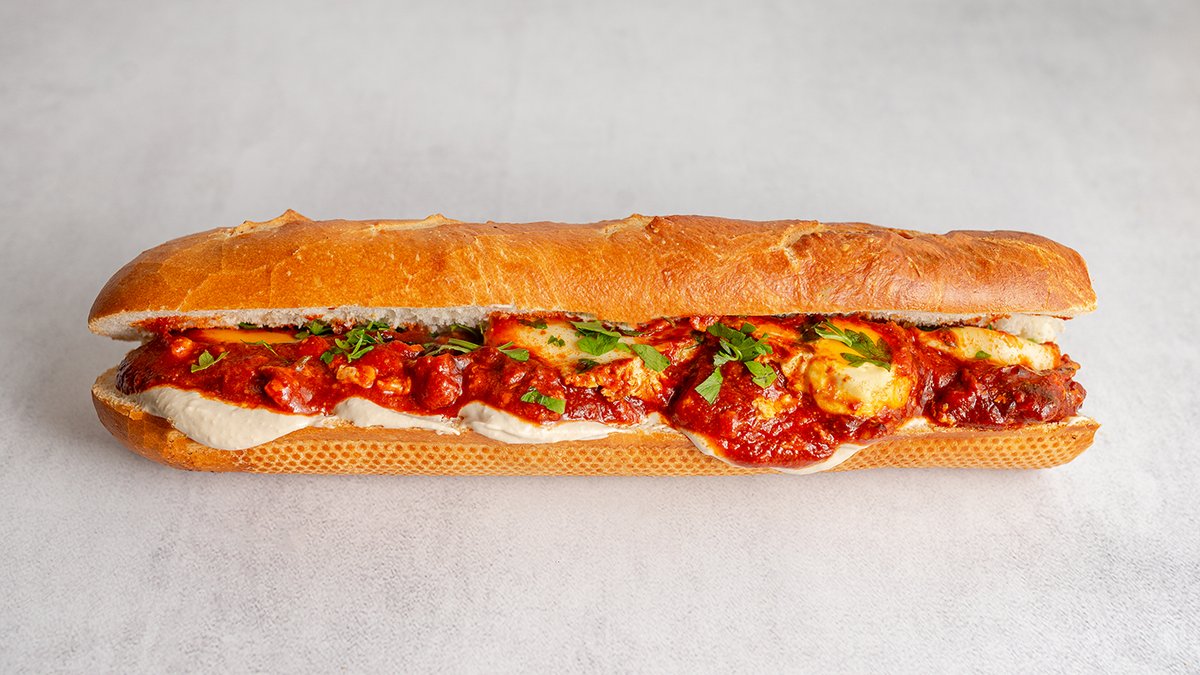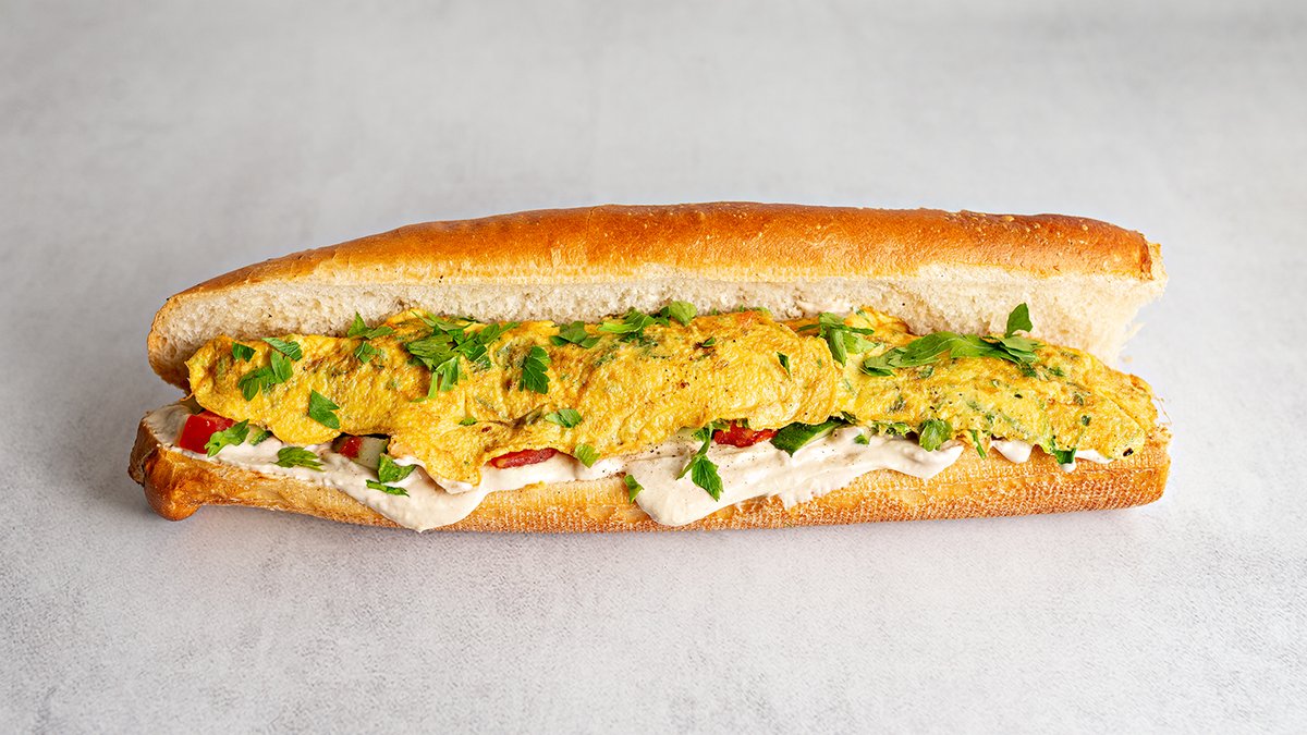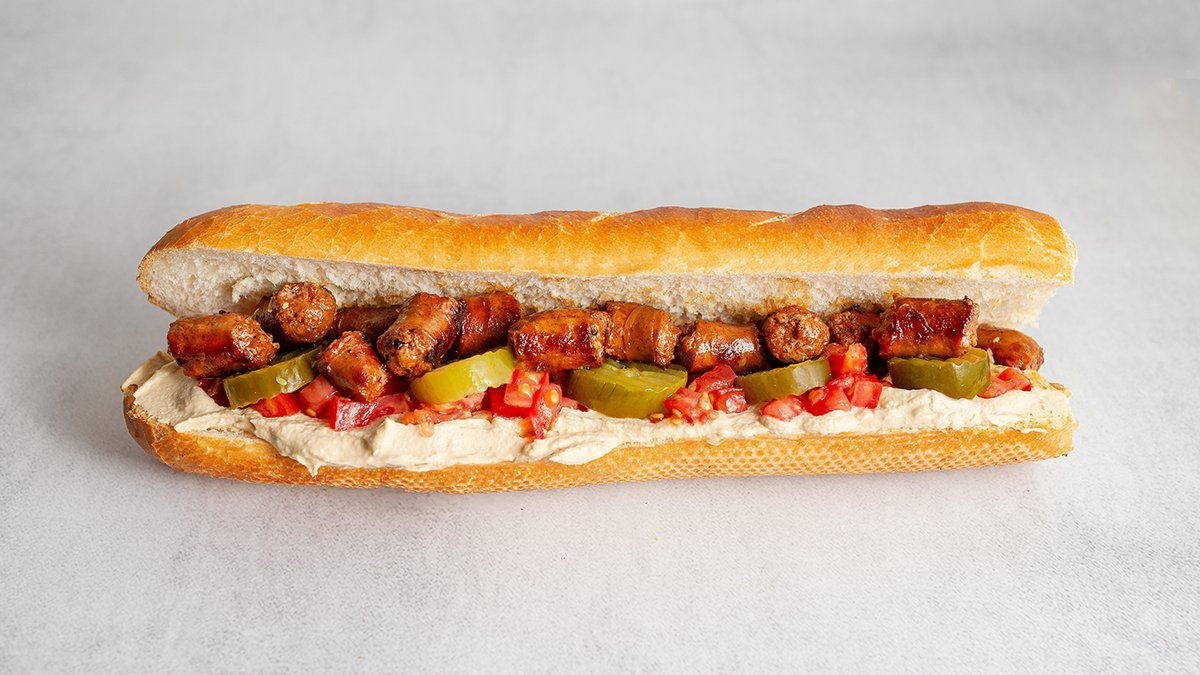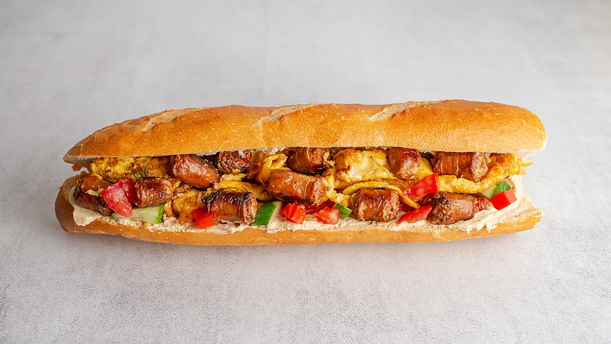 סוג נקניק, ממרחים ורטבים לבחירה בבגט מוגש עם חמוצים, זיתים ורטבי הבית
