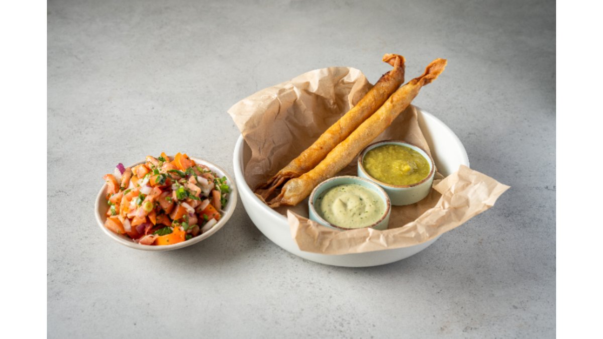קריספי רול במילוי אבוקדו, עגבניות מיובשות, בצל סגול וכוסברה מוגש עם רוטב עשבי תיבול לימון ודבש