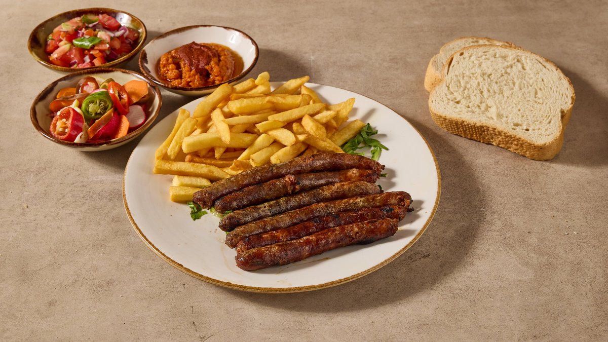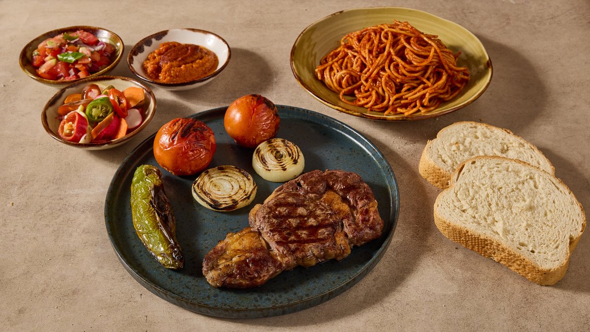 בשר בקר ותפוח אדמה מוגש עם תוספת ו-3 סלטים לבחירה