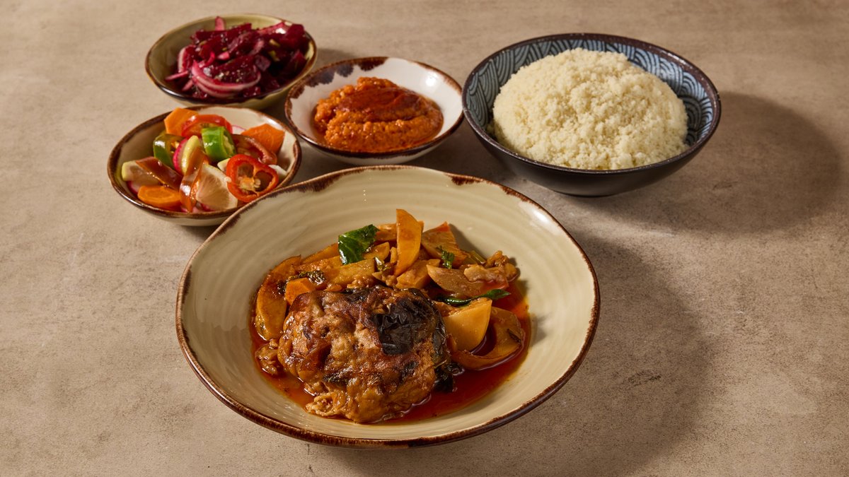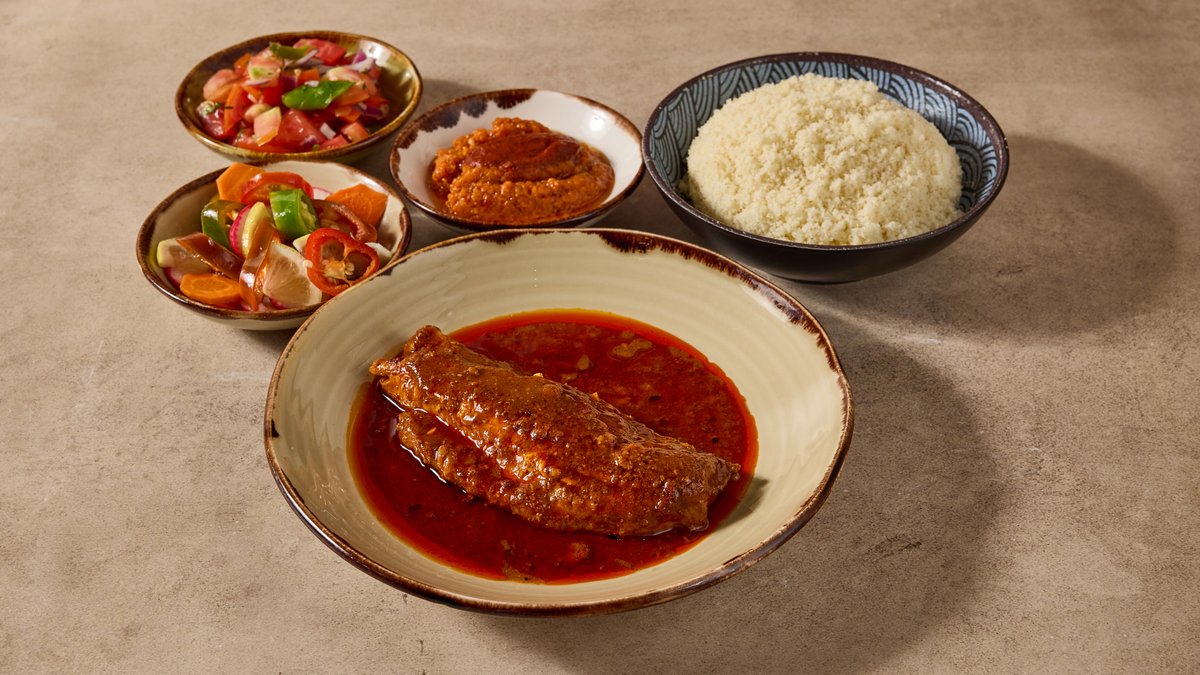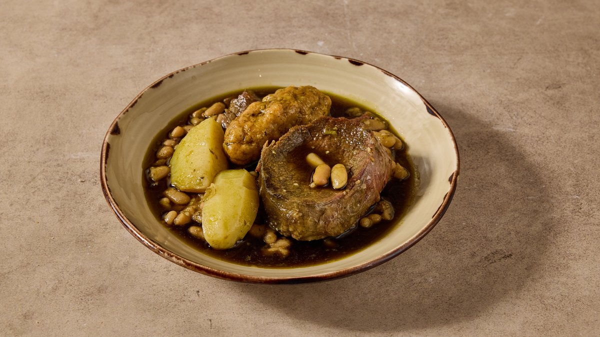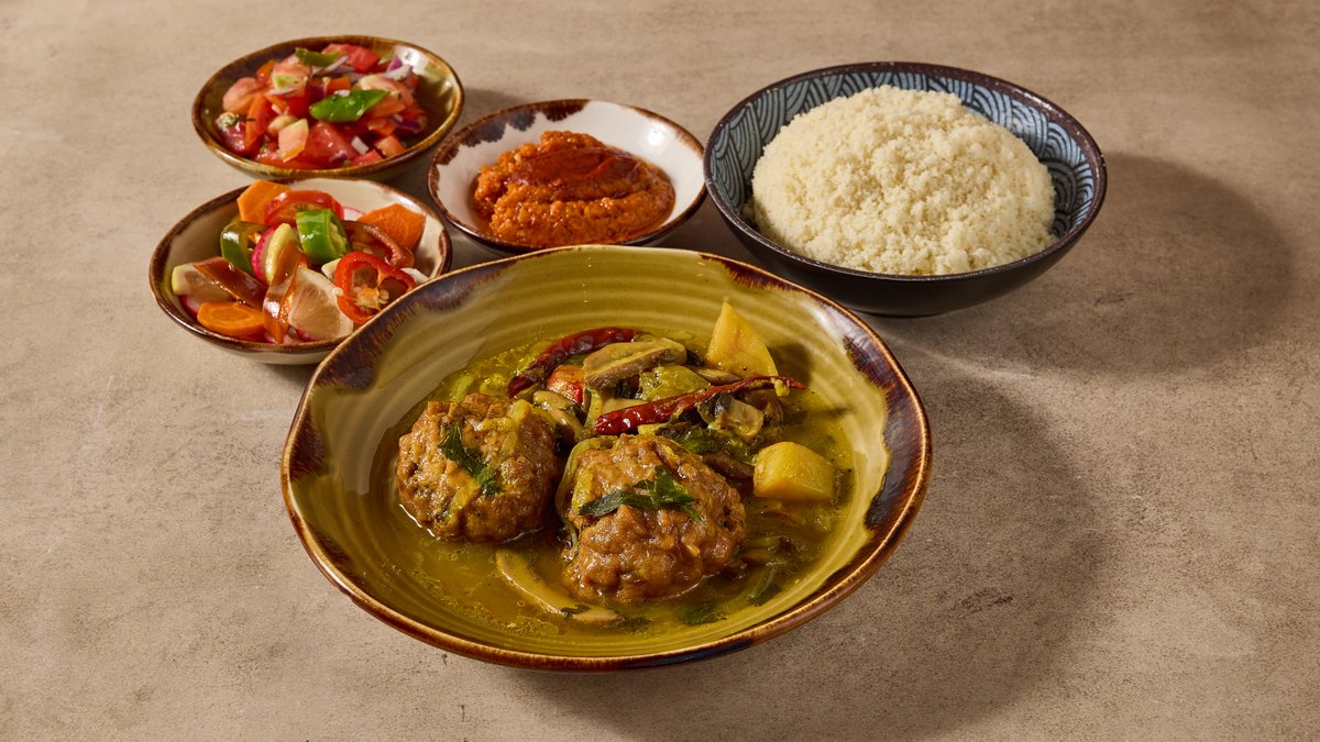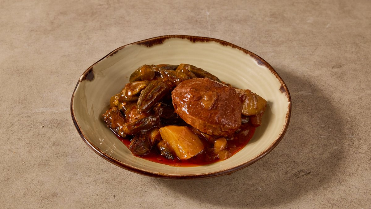 שעועית אדומה, בשר בקר ,דלעת ותפוח אדמה פיקנטי מוגש עם תוספת ו-3 סלטים לבחירה