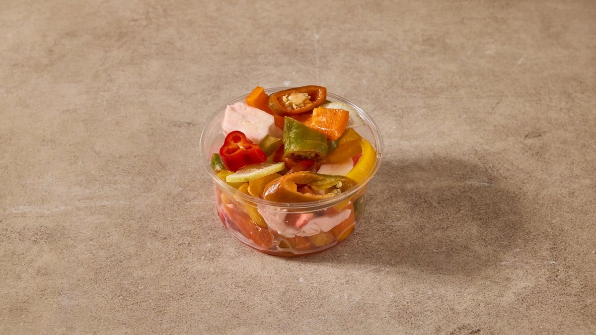 ברוטב פיקנטי עם פלפלים ופטריות מוגש עם תוספת ו-3 סלטים לבחירה