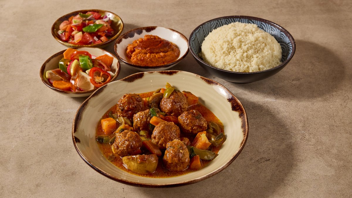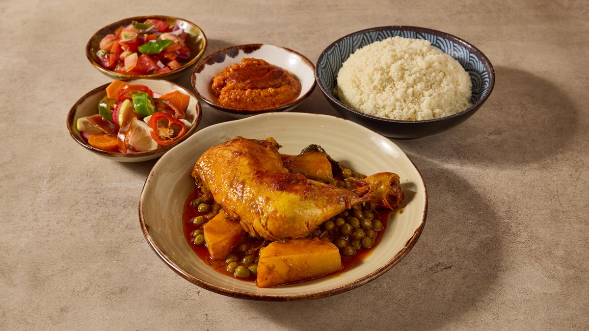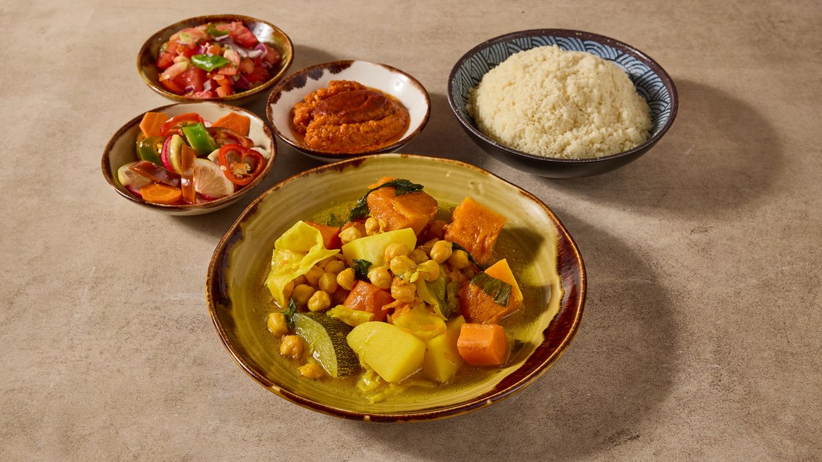 מרק קוסקוס צמחוני עם גזר, דלעת, קישוא, תפו״א, גרגירי חומוס וסלרי מוגש עם תוספת ו-3 סלטים לבחירה