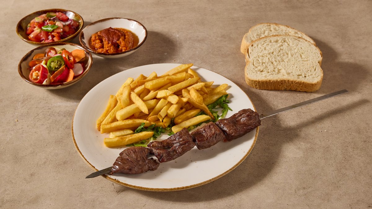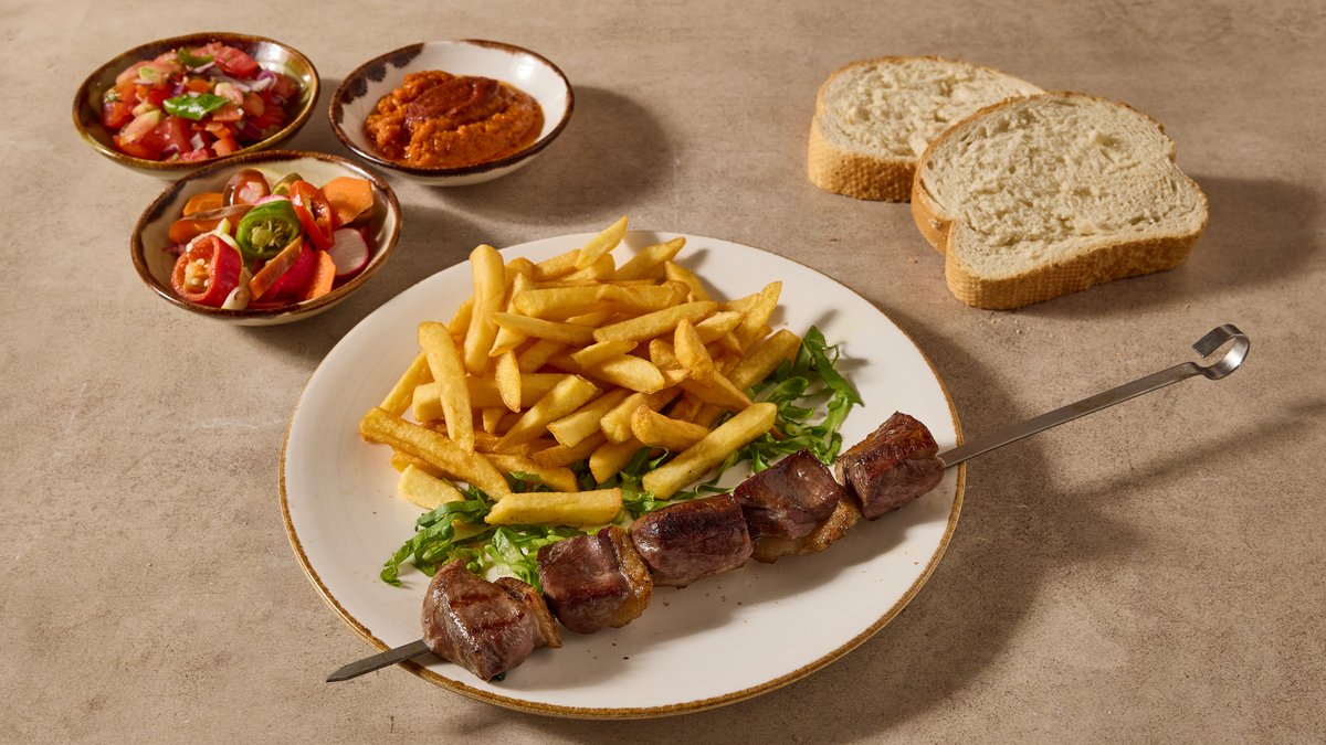 ברוטב פיקנטי עם פלפלים, תפוח אדמה ופטריות מוגש עם תוספת ו-3 סלטים לבחירה