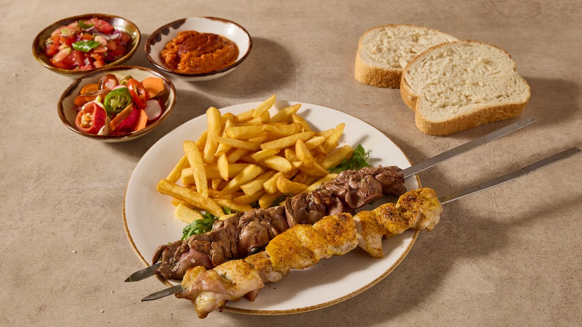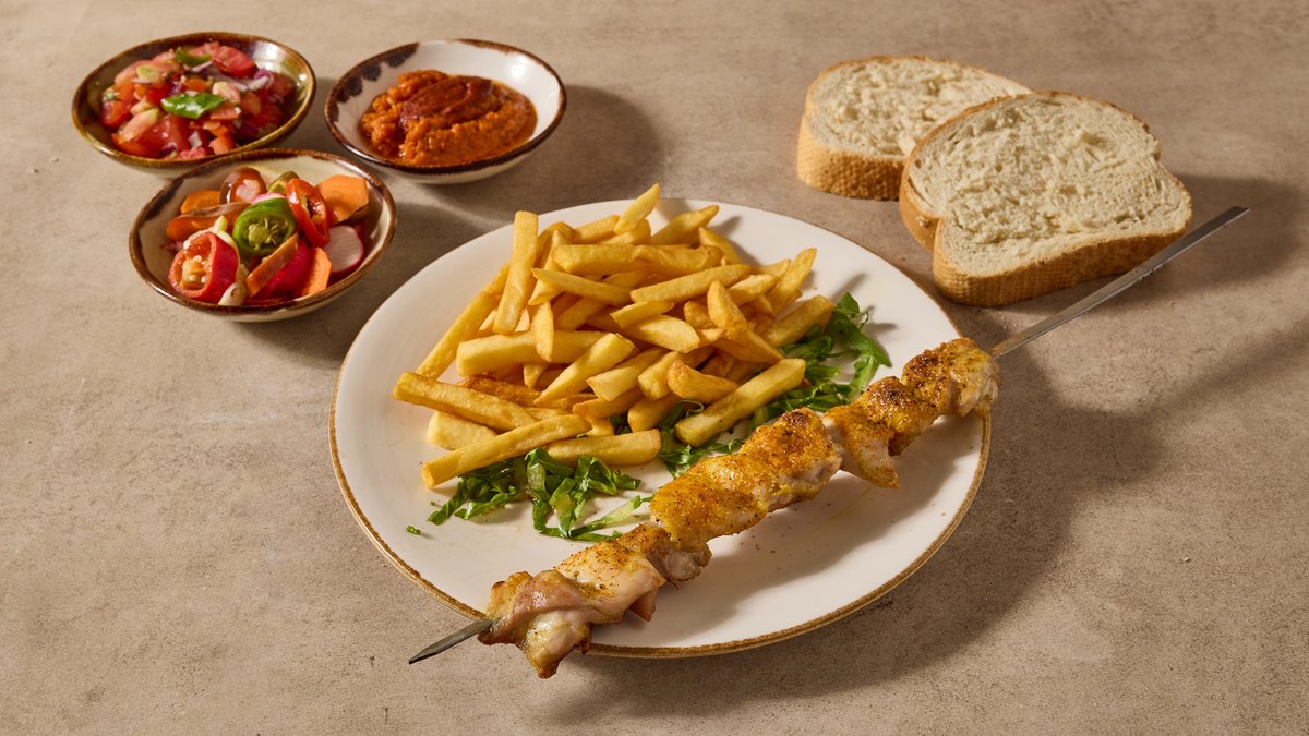 2 שיפודים, תוספת, 4 סלטים ולחם | פיתה לבחירה