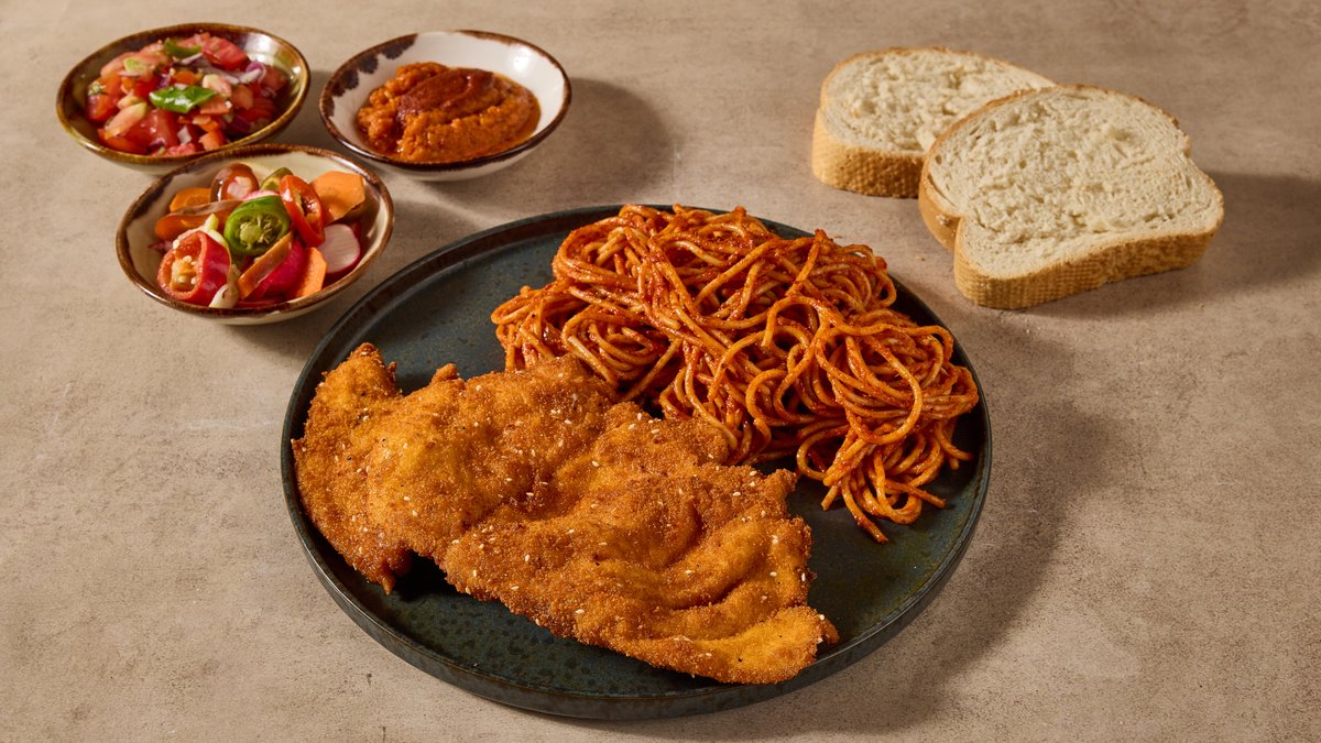 מוגש עם תוספת, לחם ו-8 סלטים לבחירה