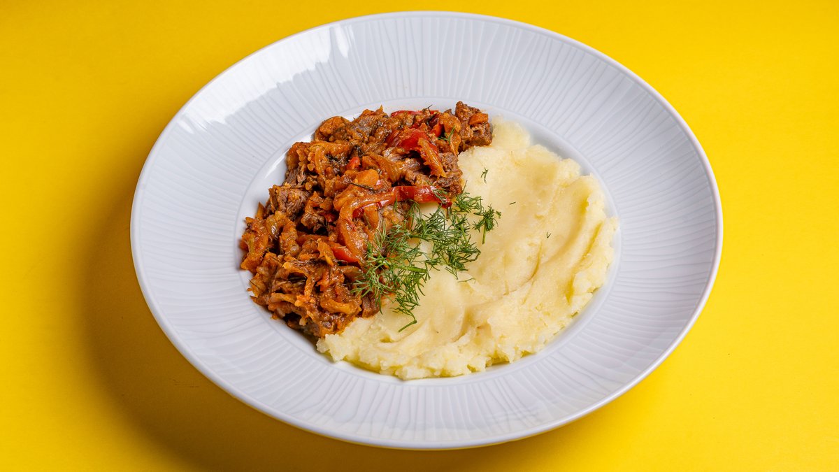 נתחי בשר עגל מבושלים ברוטב עגבניות קלויות ובצל מקורמל, מוגש עם פירה