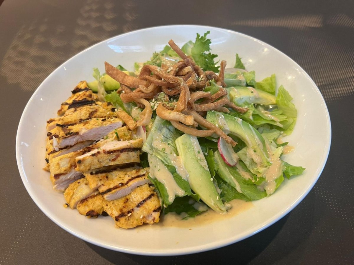 סלט קיסר יפני ברוטב מיסו, תערובת חסות, נתח חזה עוף צלוי, אבוקדו, צנונית, שומשום, שבבי אפונה וקריספי טורטייה