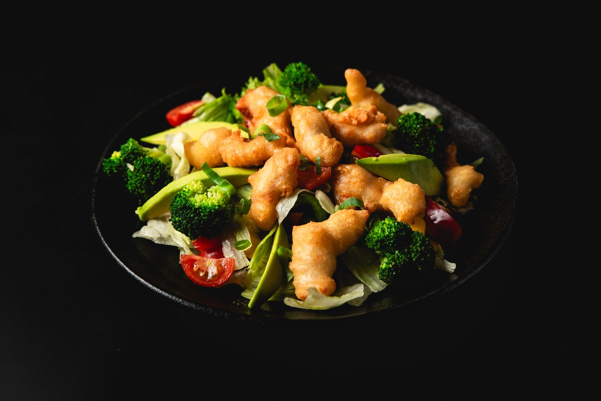 דג אמנון בטמפורה מוקפצים ברוטב פיקנטי עם חלב קוקוס, צ'ילי ותמרינדי, גזר, ברוקולי, בצל סגול, פלפל אדום, קולורבי, בצל ירוק ,עלי תרד ופטריות. מוגש עם אורז מאודה. מכיל גלוטן